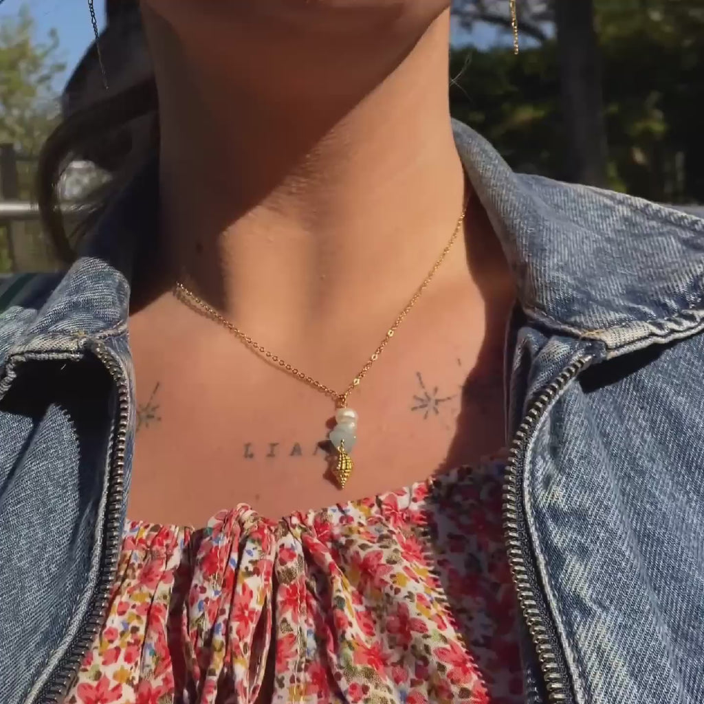 Aya halskæden er en sød halskæde med et konkylievedhæng med en naturlig ferskvandsperle og aquamarin.
