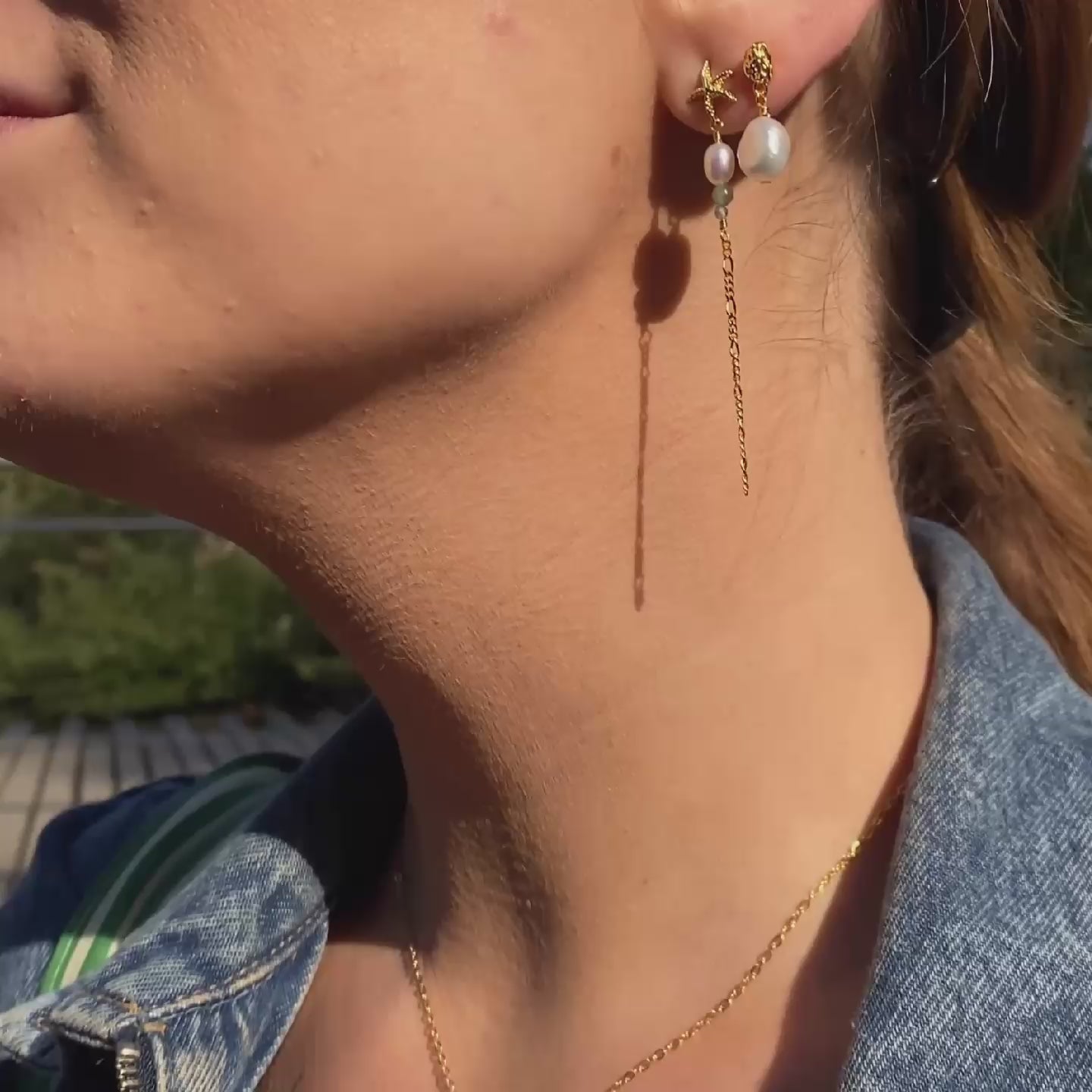 Stella øreringene er et par ørestikker formet som søstjerner. De er desuden prydet med en dekorativ kæde, naturlige ferskvandsperler samt perler af aventurin og apatit.