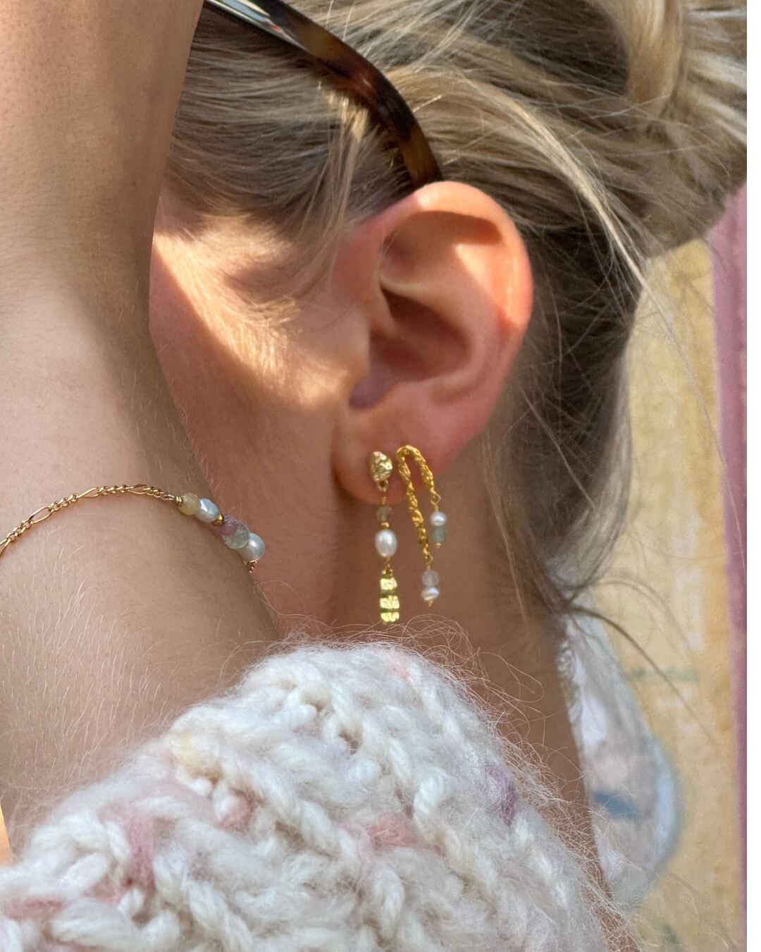 Med kæde øreringe trækker du kæden gennem hullet i øret, således at du har et stykke kæde hængende bag ved øret og selve kæde øreringens vedhæng hængende foran. Det skaber liv og bevægelse til dit smykkelook.