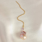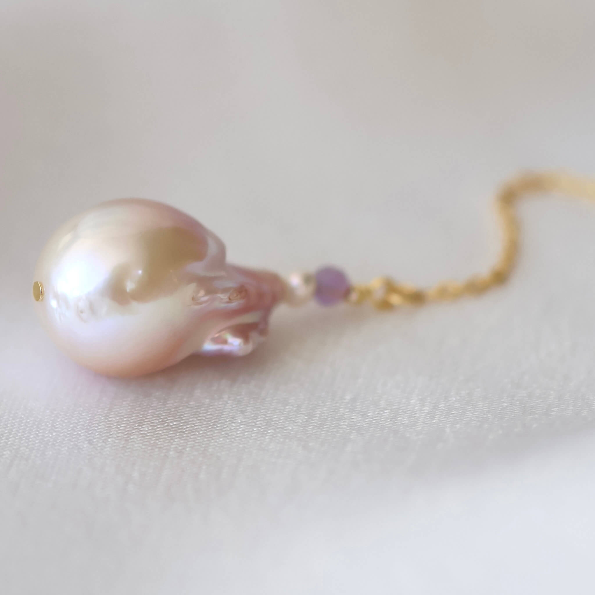 Denne fine ørekæde er designet med en stor flot barok ferskvandsperle i lilla nuancer. På toppen af den er en helt lille hvid ferskvandsperle og en lille halvædelsten af ametyst.