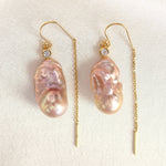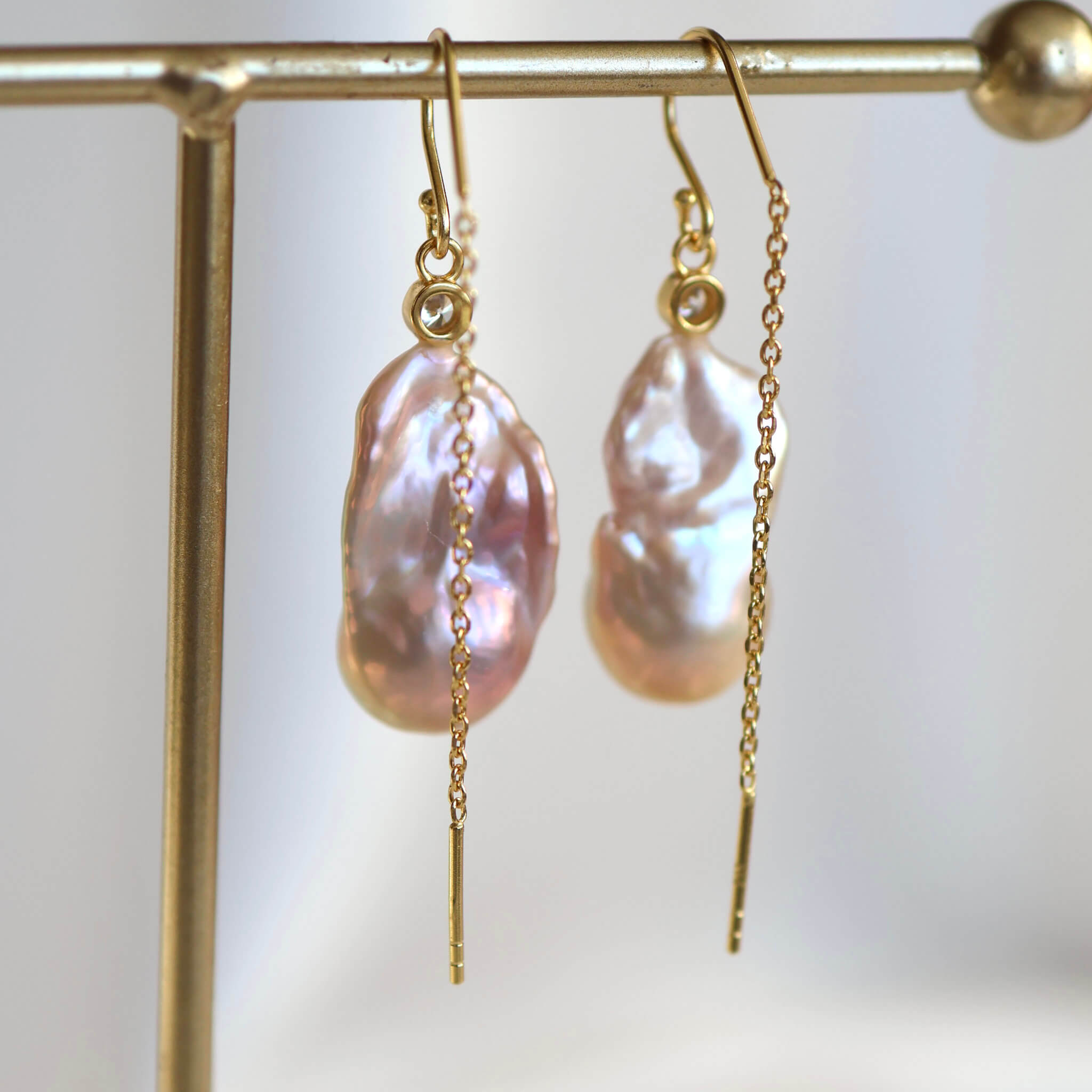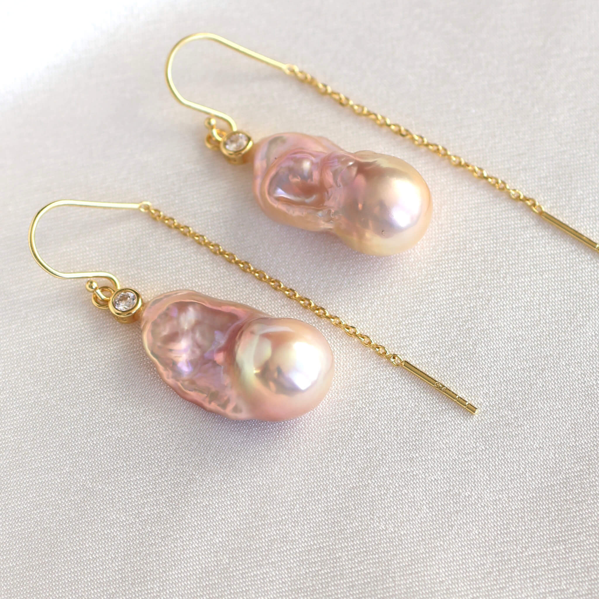 Et par helt særlige ørekroge med lyserøde barok ferskvandsperler i alverdens smukke nuancer. De er designet med kubisk zirkonia på toppen af perlerne og et stykke kæde, der hænger bag øret.